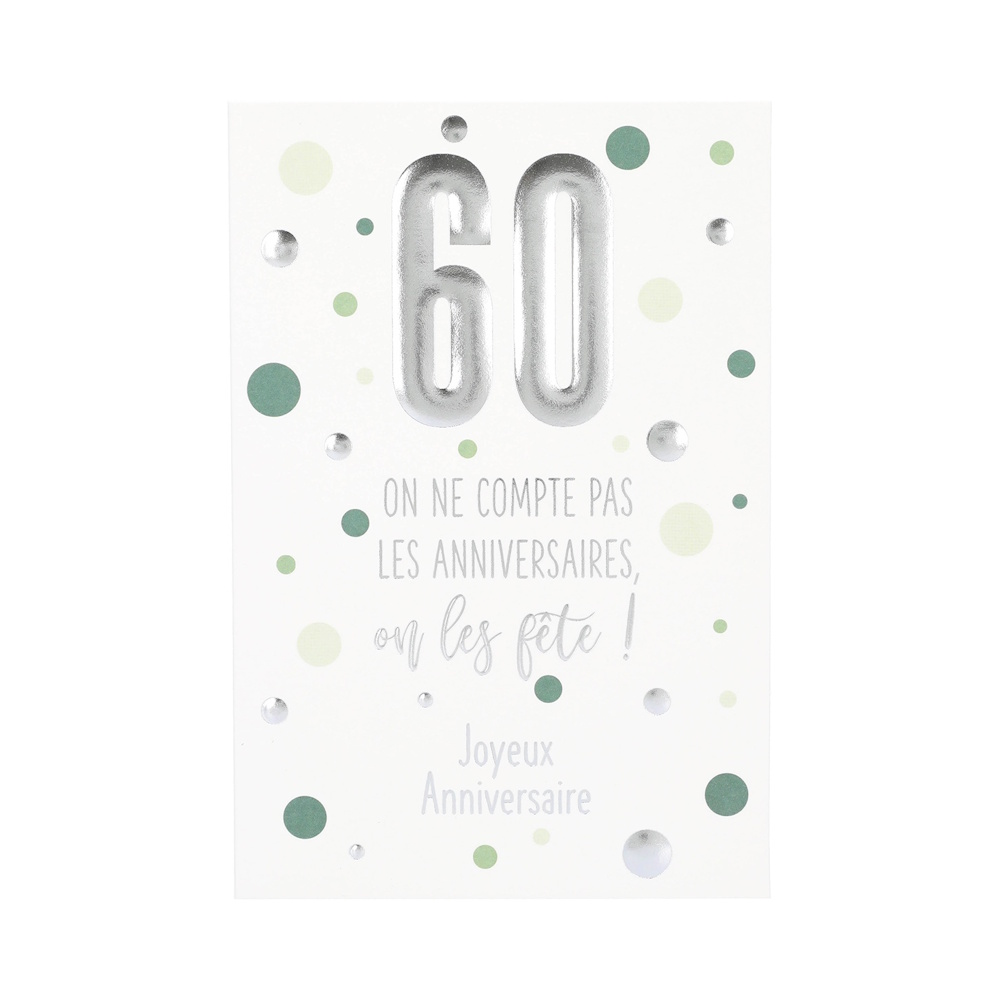 Accueil → Papeterie → Cartes de Vœux → Anniversaire Carte Anniversaire - 60 ans On ne compte pas les anniversaires on les fête ! 3,75€ stock :5 Quantité Description Détails : Carte de voeux et son enveloppe - Texte en relief et argenté Dimensions carte : 17.2 x 11.5 cm Thème : Anniversaire Modèle : 60 ans On ne compte pas les anniversaires on les fête ! L'avis des Clients Pas de note client (Mettre un commentaire en premier) Commentaires Rédiger un commentaire