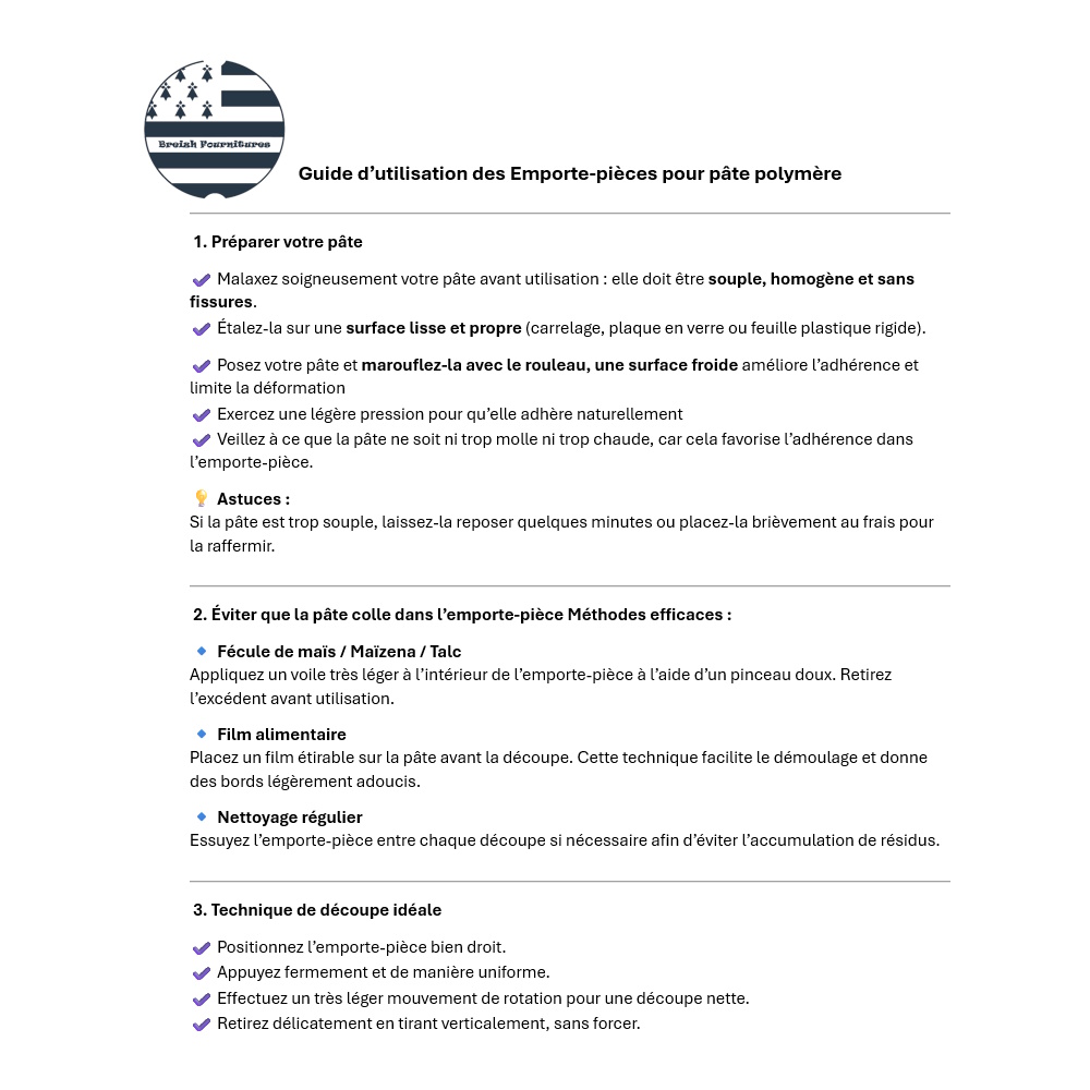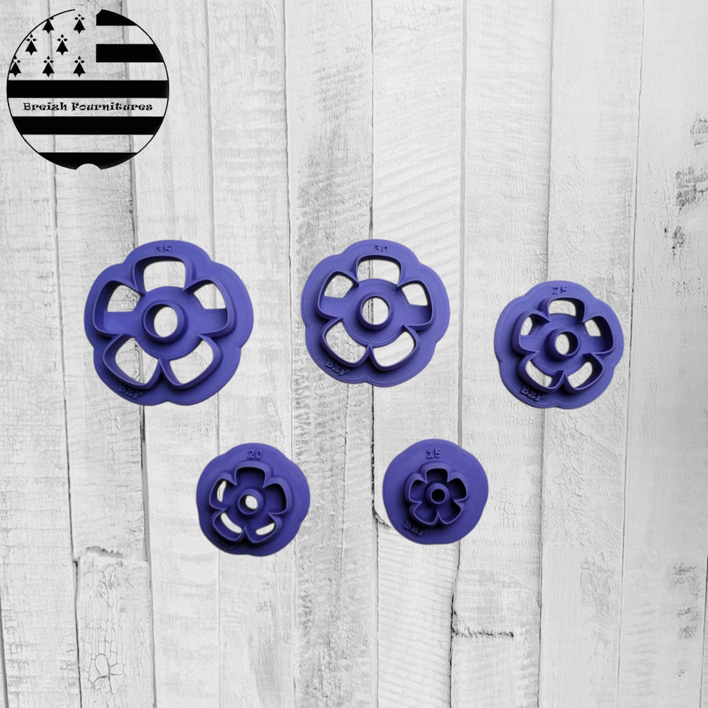Accueil → FAIT-MAIN Créations Artisanales → FOURNITURES DIY → Emporte-pièces → Fleurs Emporte-pièce pour Pâte Polymère, Fleur Outil de Création DIY 2,75€ stock :500 taille: 15mm20mm (+0,25€)25mm (+0,50€)30mm (+0,75€)35mm (+1,00€)    En stock taillePrixQty.15mm2,75€100.20mm3,00€100.25mm3,25€100.30mm3,50€100.35mm3,75€100. Quantité Description Créez facilement vos bijoux et décorations DIY grâce à cet emporte-pièce de précision, découpe nette et précise. Parfait pour les créateurs, artisans et passionnés de loisirs créatifs 🛠️ Caractéristiques :✔️ Taille : dimension intérieure la plus large (tolérance de +/- 1mm)✔️ Bord fin pour une découpe précise et nette✔️ idéal pour la pâte polymère, la pâte à modeler, la porcelaine froide et d’autres matériaux✔️Matériau : PLA éco-responsable, non polluant, non toxique. 100% biosourcés, étant issu de ressources renouvelables telles que le maïs ou la canne à sucre.🧼Conseils d’utilisation :• Cf Guides en photo.• Lavable et réutilisable, Nettoyage à la main uniquement, à l'eau tiède savonneuse ou lingettes humides.⚠️ Information importanteNe pas mettre au lave-vaisselle - Ne pas exposer à une source de chaleur élevée - Usage non alimentaire – destiné aux loisirs créatifs. ⚓ Fabriqué avec soin dans mon atelier en France, Bretagne 📦 Expédition soignée en suivi🎨 Personnalisation possible ! Besoin d’une taille spécifique ? Contactez-moi pour une commande sur mesure !📩 Besoin d'aide ?Une question, un souci avec votre commande ? N’hésitez pas à me contacter, je serai ravie de vous aider et de trouver une solution ! 😊 L'avis des Clients Pas de note client (Mettre un commentaire en premier) Commentaires Rédiger un commentaire